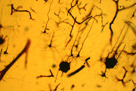 1906年に第6回ノーベル賞を受賞し神経解剖学の父と呼ばれる、カハール博士 Santiago Ramón y Cajal が作成したプレパラート。材料は、おそらくヒトかネコ、少なくとも哺乳類の脳。やや小型の三角形の細胞は錐体細胞 pyramidal cell である。この写真は、筆者がマドリッドのカハール研究所で講演するために訪問した際、プレパラートの観察と撮影の許可を得て、持参したカメラとアダプターを研究所の顕微鏡に取り付けて撮影した。