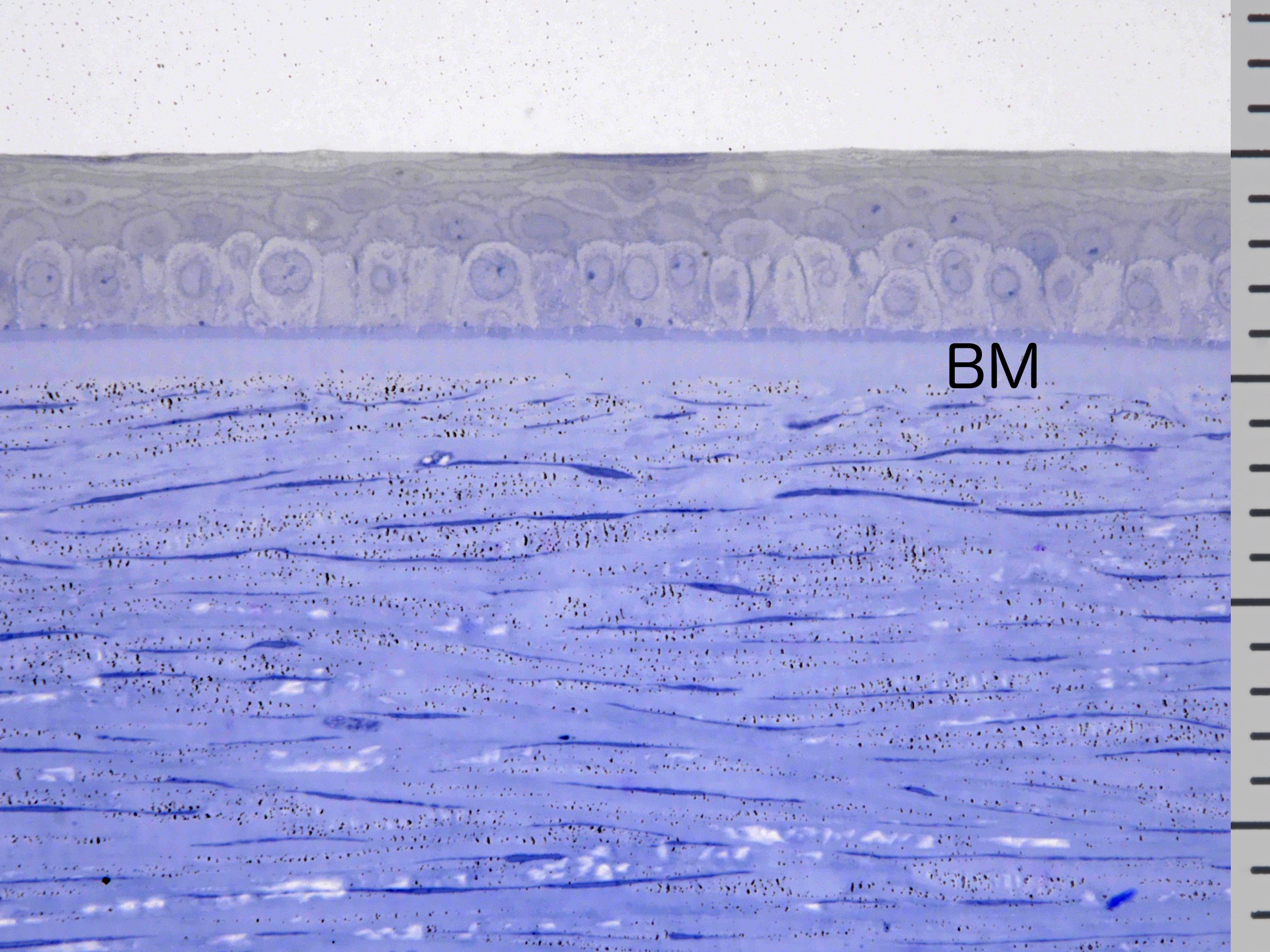 この写真には、BMで示したボーマン膜 Bowman’s membrane をはさんで、角膜上皮 corneal epithelium と角膜実質 corneal stroma (固有層ともいう)が見える。角膜上皮は、厚さ 40 μm 程度の重層扁平上皮であり、表面に近い上皮細胞ほど扁平であることが分かる。ボーマン膜は、やや濃染する厚さ 2 μm 程度の層(上皮細胞の基底板)と、その下の淡染する厚さ 8 μm 程度の層の 2層からなるが、教科書的には 1層と記述される。実質は、大部分が細胞外物質からなり、ところどころに濃染する扁平な繊維芽細胞が散在する。この細胞外物質の主成分は I型コラーゲンというタンパク質である。