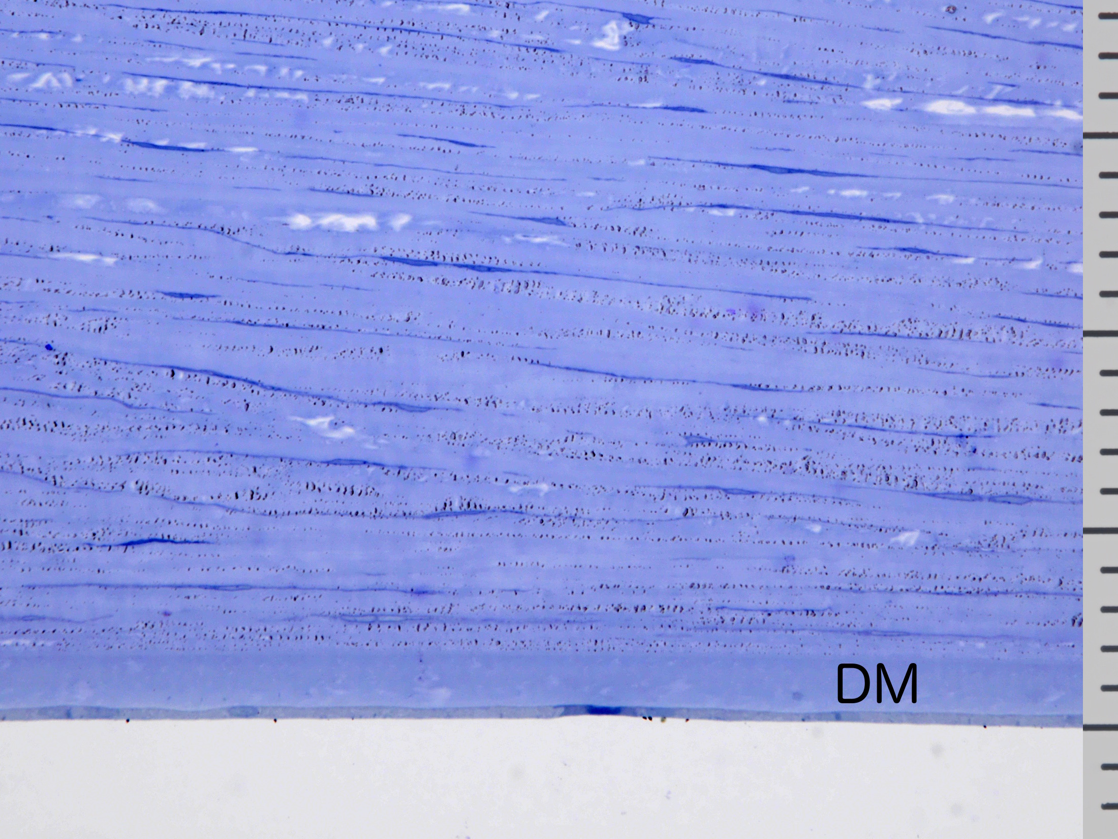 この写真には、DMで示したデスメ膜 Descemet’s membrane をはさんで、角膜実質と角膜内皮 corneal endothelium が見える。角膜内皮は厚さ 2〜3 μm であり、1層の扁平な内皮細胞からなる。デスメ膜は厚さ 10〜12 μm であり、ボーマン膜に似た均質な層である。