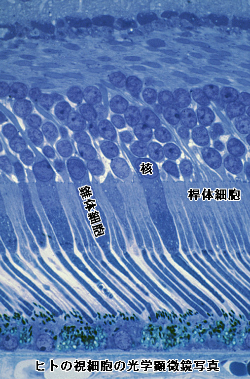 網膜色素上皮から外網状層までの網膜外層。視細胞は典型的な双極性の神経細胞で、細胞体を外顆粒層にもち、樹状突起に相当する内節と外節を桿体錐体層に、軸索を外網状層に伸ばす。明所視で色を感じる錐体細胞 cone cell と、暗所視で明暗だけを感じる桿体細胞 rod cell の2種類の視細胞 photoreceptor cell がある。錐体細胞は機能的には赤、緑、青を感じる3種類がある。