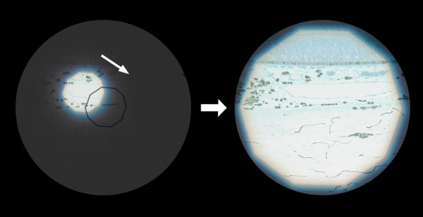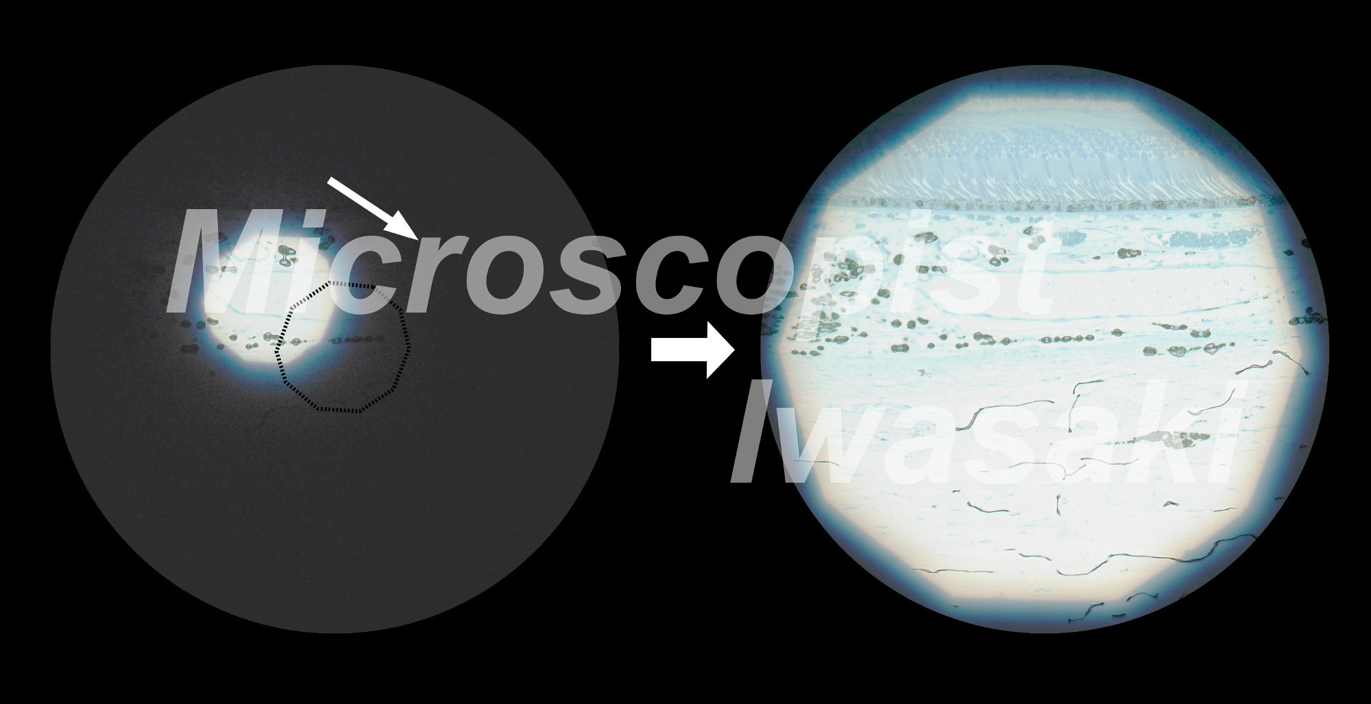 ケーラー照明の設定(LM)。光学顕微鏡の性能をフルに引き出すには、ケーラー照明の設定が不可欠である。設定のポイントは、標本にピントが合った状態で視野絞りにもピントが合っていて、しかも視野の中心にあるようにすることである。真円が接眼レンズの視野円、多角形に見えるのが視野絞りの像。